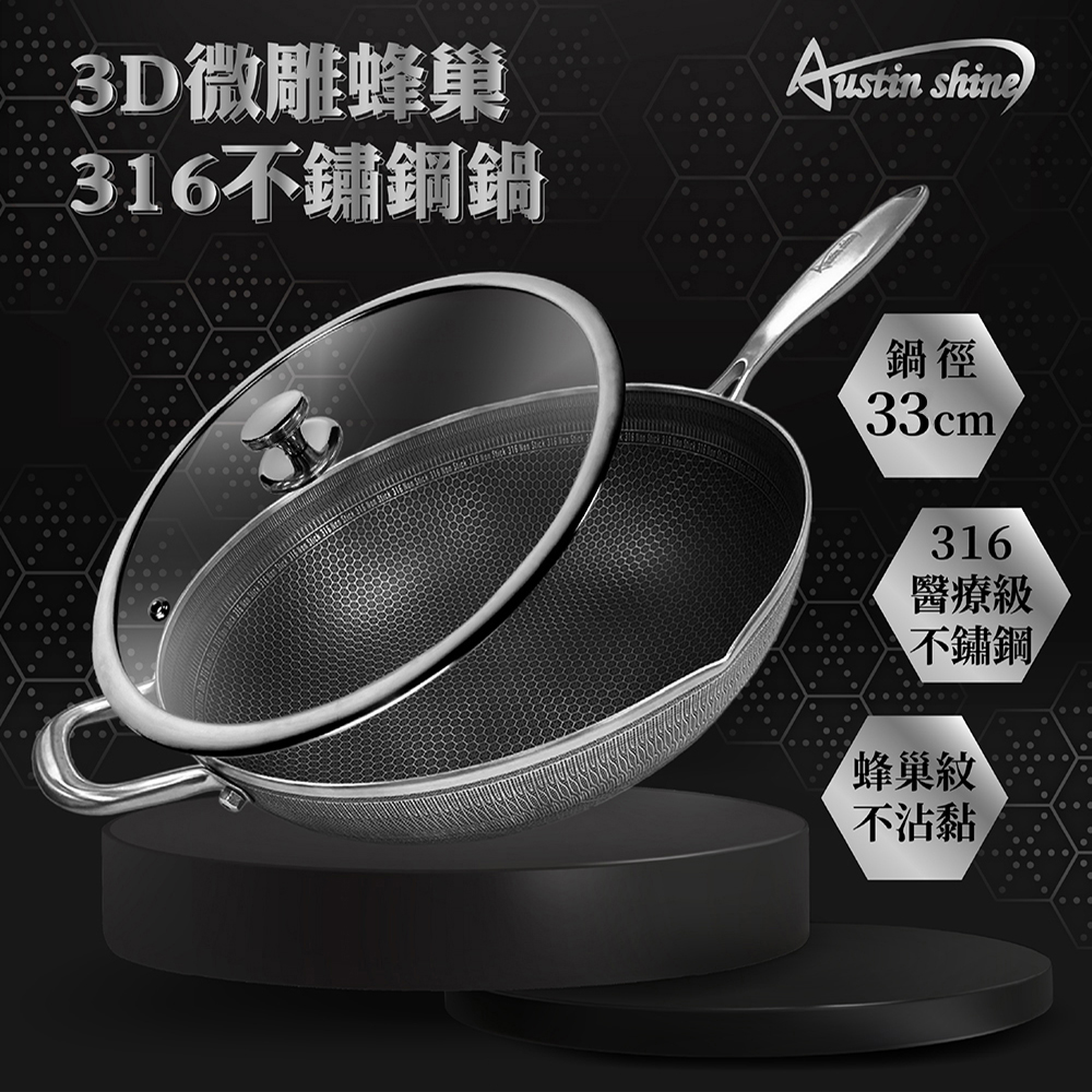 ◎品名:3D蜂巢 316不鏽鋼 33cm炒鍋 (附玻璃鍋蓋)