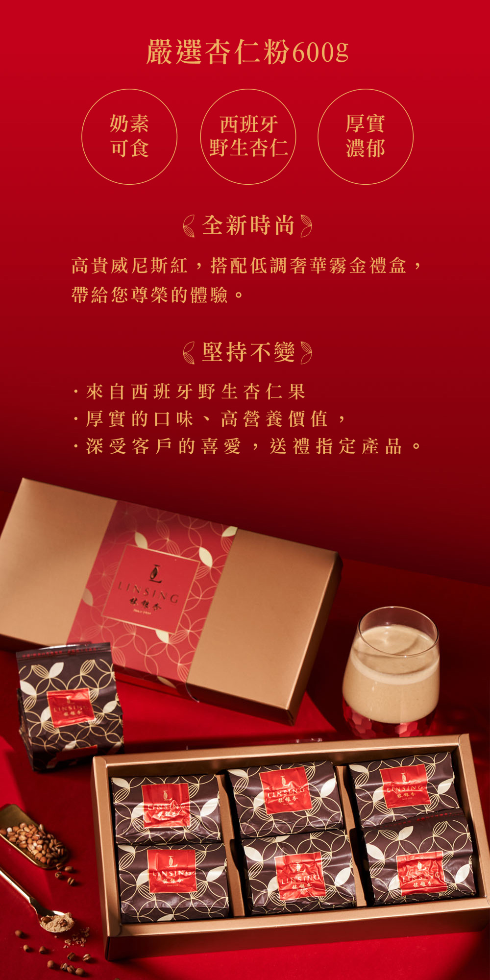 黃金比例調配| 結合加州精品杏仁的滑順與西班牙野生的強烈香氣,打造出層次分明的頂級口感。