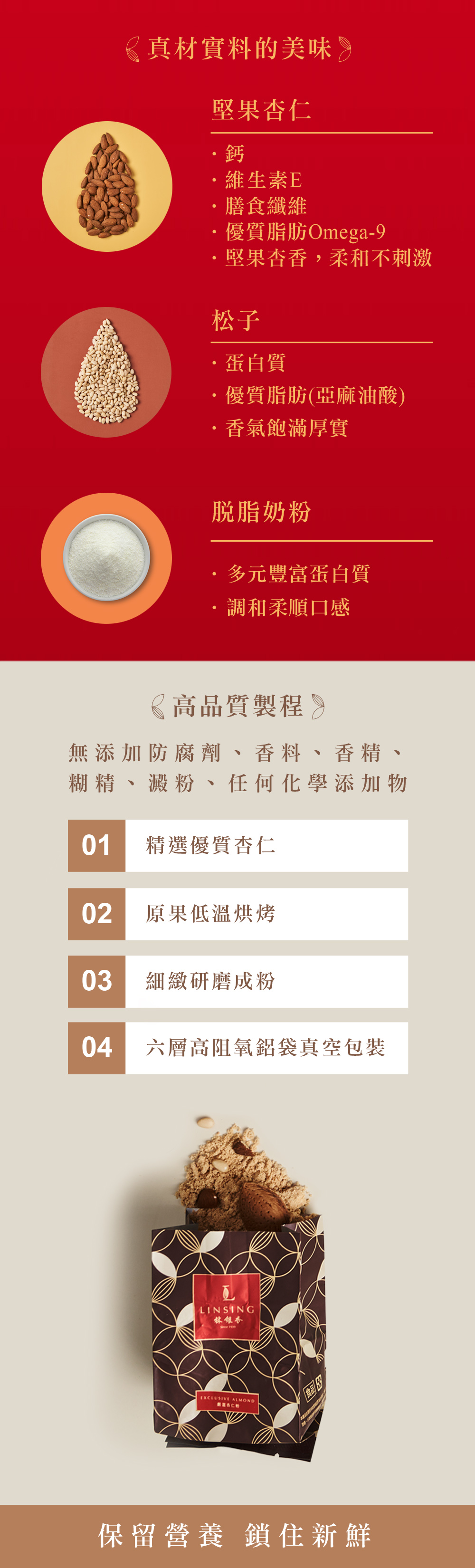 維持保鮮優勢| 採用獨立六層高阻氧真空包裝,確保珍貴的西班牙野生杏仁油脂不因接觸空氣而氧化。